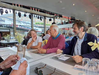 Die Rückfahrt nach Düsseldorf war auch sehr kurzweilig. Die von Anne und Lothar eingepackten Würfel und Karten blieben eingepackt. Denn die Unterhaltung am Tisch und an Deck war so lebhaft, dass ich die Gruppe darauf hinweisen musste, dass die Fahrt in Düsseldorf leider endet und wir nun das Schiff verlassen müssen.
